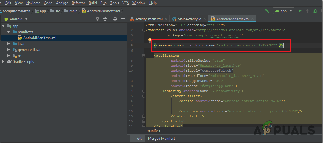 3.Since we are going to use the internet to control the pins of the raspberry pi. We will set permission in our app to access local wifi. To do this, go to app > manifests > AndroidManifest.xml and add the following command.