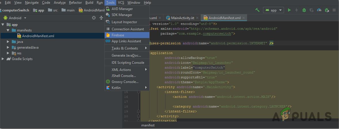 3. Now, click n Tools. A drop-down menu will appear from which, select Firebase.