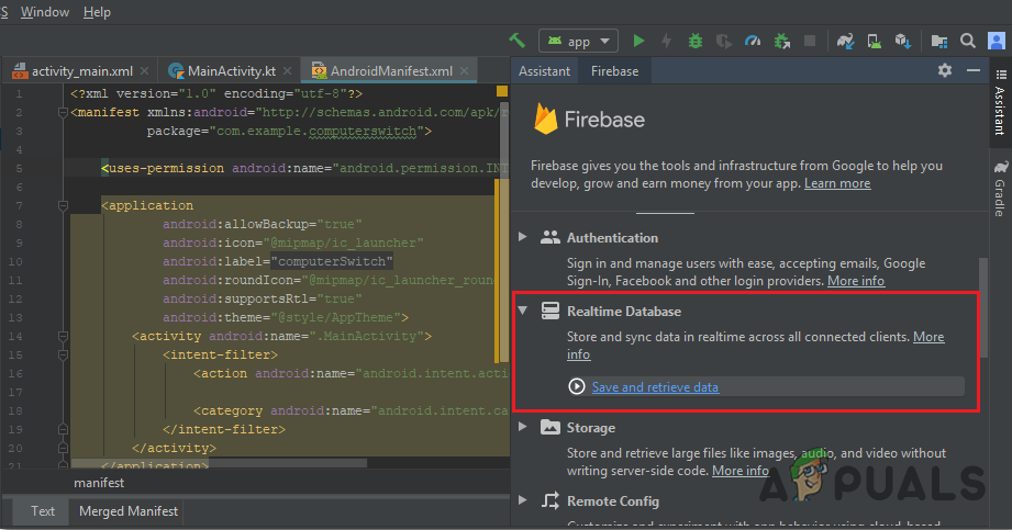 5. Connect on Connect To Firebase button. It will take you to the default web browser. First, it will ask you to log-in to your Gmail account. Then click on Add the Realtime Database to your app and accept the changes.