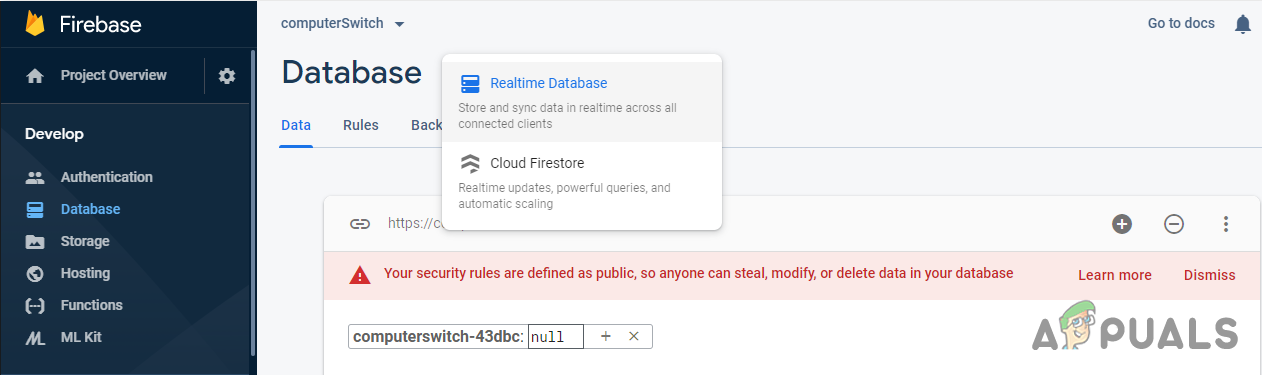 9. Now a really important step to remember is to change the Cloud Firestore to Real-Time Database. To do so click on the button shown in the below image and change the desired option.