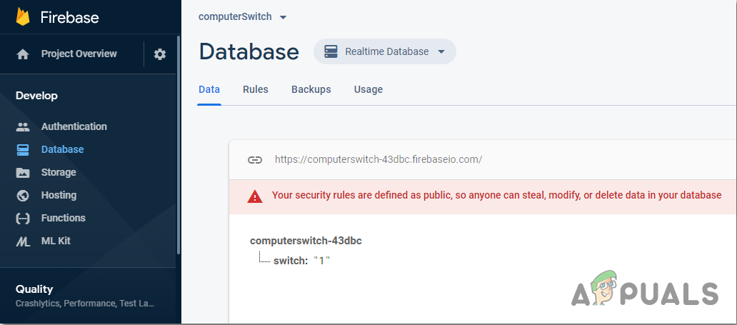 } In the below image, you can see that if the switch is turned on, “1” is uploaded to the firebase database. Similarly, a “0” will be replaced here when the switched is turned off.