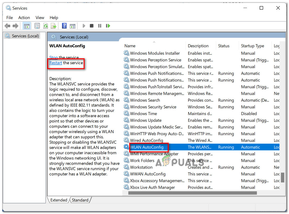 - Now go back to the enlisted services and click on “Restart the service” (on the left panel) while “WLAN AutoConfig” is selected.