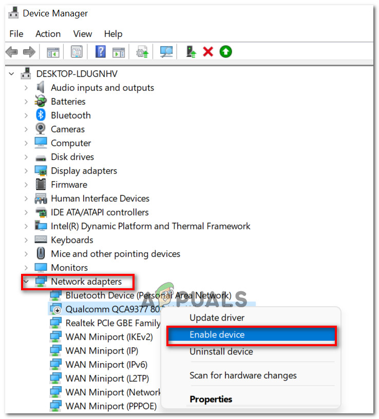 - Right-click on the relevant network adapter and select “Enable”.