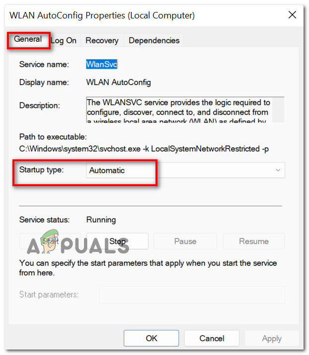 - A new window will open. Ensure that in the “General” tab the “Startup Type” is set as “Automatic”.