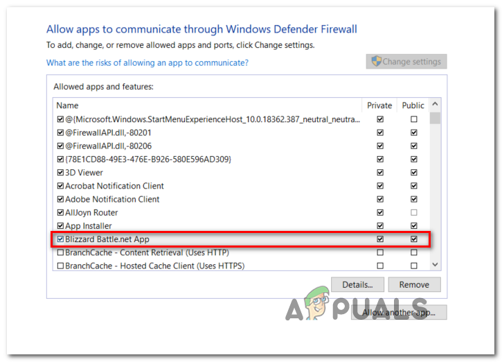 - Once you’ve made sure that both entries appear inside the list of Allowed apps and features, ensure that the two associated boxes (Private and Public) are checked for both of them. Do this for the Blizzard Battle.net app and for World of Warcraft and click Ok to save the changes.