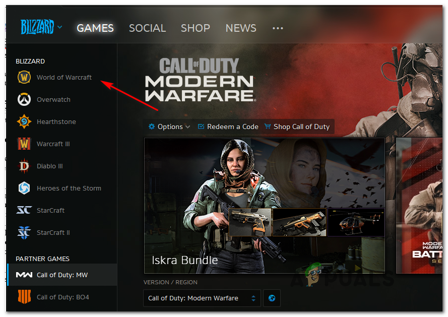- Once you’re inside, select the Games tab at the top of the window, then click on World of Warcraft from the list of game titles on the left.