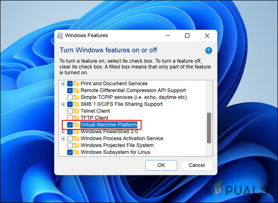 - Now, locate Virtual Machine Platform in the following dialog and checkmark the checkbox associated with it to enable it.