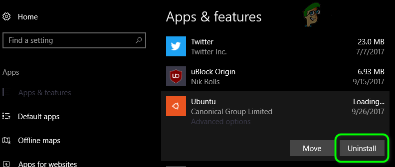 - Now, find and click on your Linux Distribution Application, e.g., if you are using Ubuntu, click on Ubuntu. Then click on Uninstall.