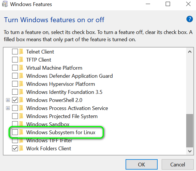 Turn Windows Feature on or off - Now, scroll down till the end and enable Windows Subsystem for Linux Option.