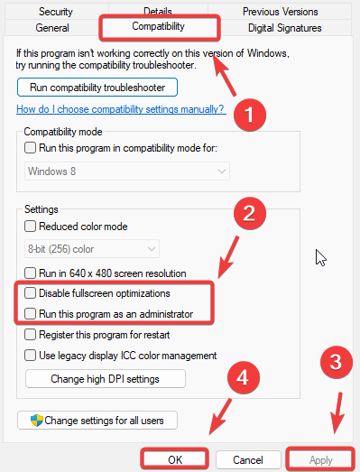 In the vast majority of cases, configuring the compatibility settings correctly often resolves the issue of not launching. Compatibility settings include running the program as an administrator, disabling full-screen optimizations, and running the program in an older version of Windows, among others.
