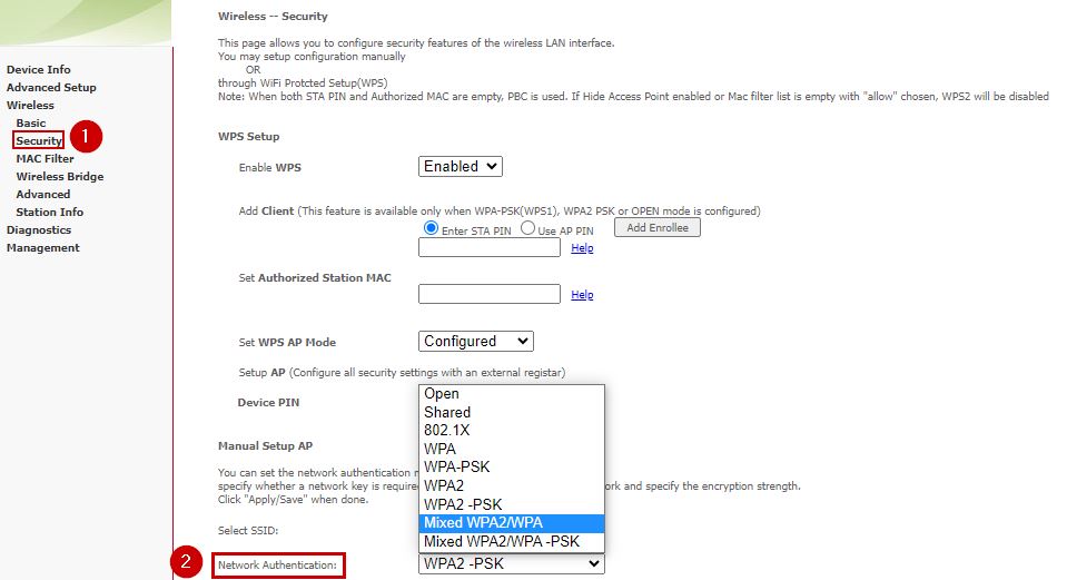 - Select the Network Authentication as WPA2 or WPA/WPA2.