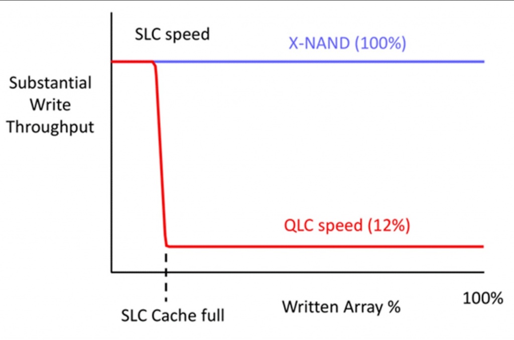 While consumer QLC drives heavily rely on SLC caching (using a small amount of SLC NAND to speed up processes), X-NAND enables the flash to maintain SLC performance for longer. This is achieved by simultaneously allowing SLC and QLC write modes, a process not currently implemented in QLC drives.