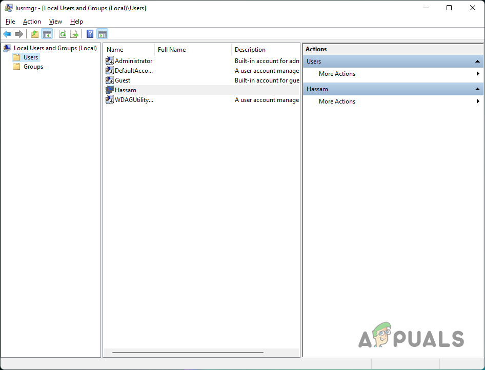 Opening up Users and Groups Window - On the Local Users and Groups window, select the Users folder and then on the right hand side, double click on the user account that you are signed into.