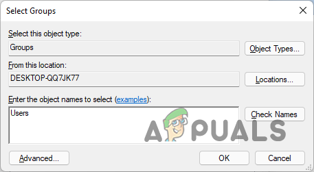 Searching for Users Group - Click the OK button. Follow it up by clicking Apply and OK again. See if that resolves the issue for you.