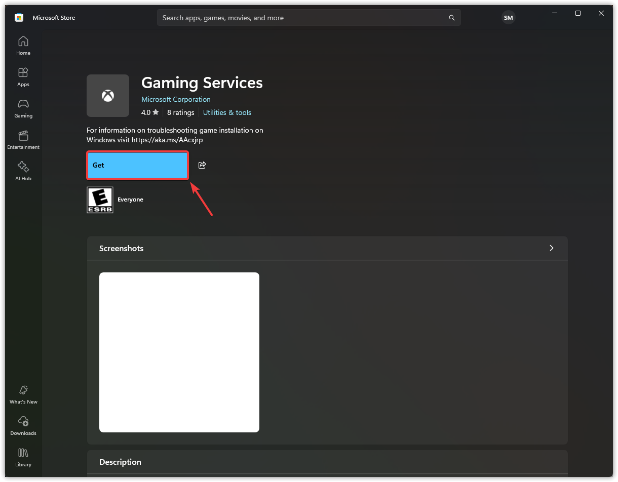 - When the Store page appears, click Get to reinstall Gaming Services.