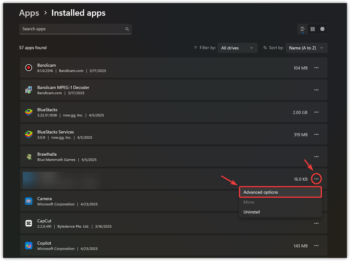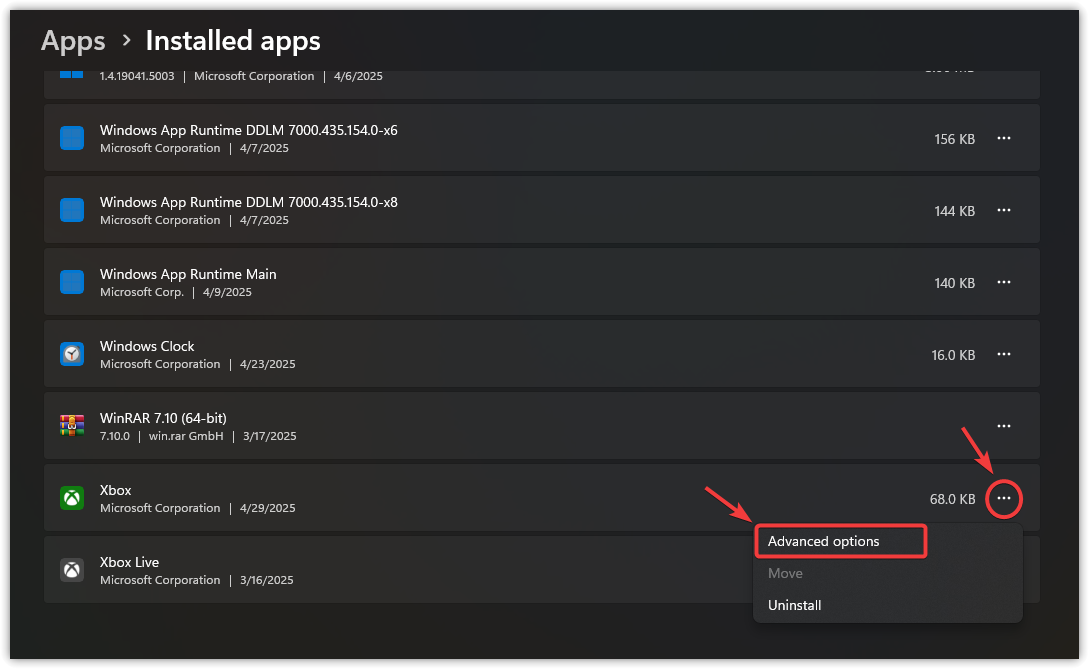 - Go back to the list, find the Xbox app, click the three dots, and select Advanced options.
