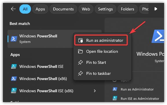 - Press Win + S, type PowerShell, right-click it, and select Run as administrator.