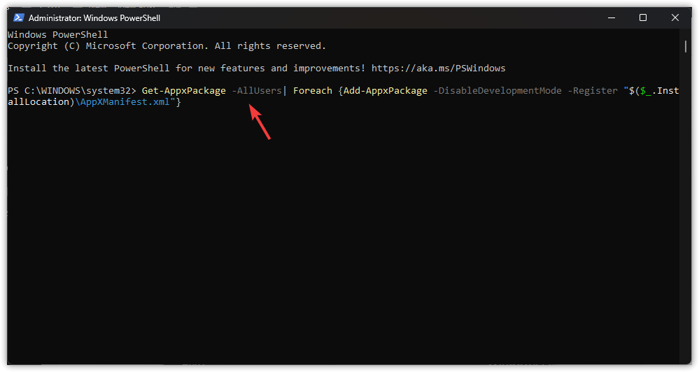 - Copy the command below, paste it into PowerShell, and press Enter to re-register all Store apps: