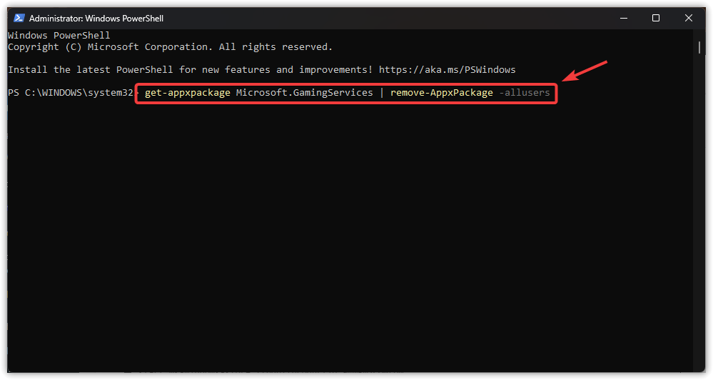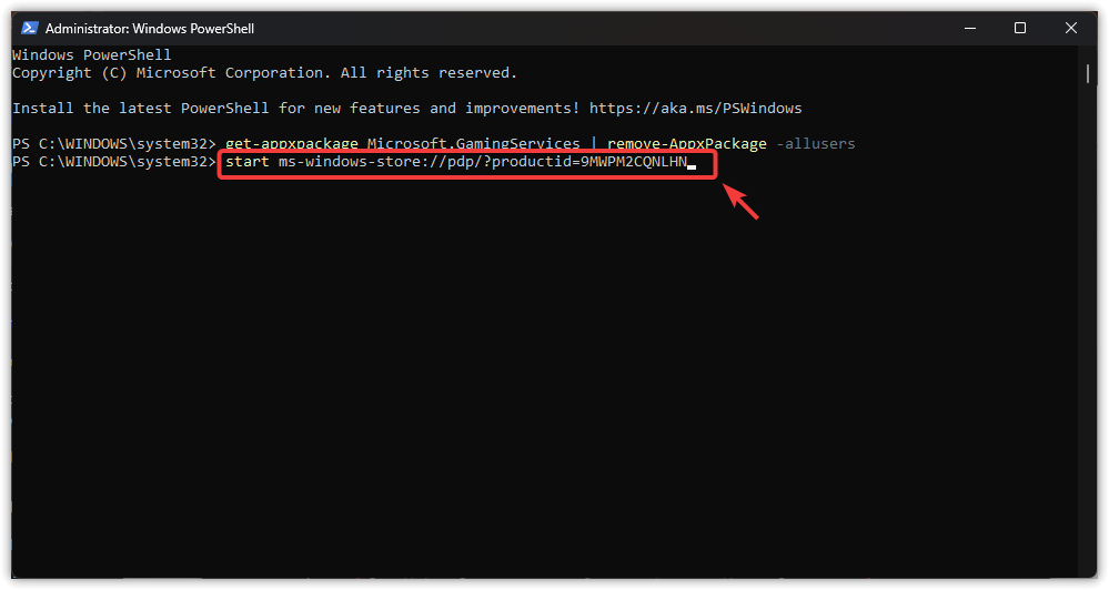 - After the removal completes, run this command to open the Microsoft Store page for Gaming Services.