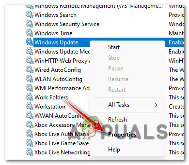 - Once you find the Windows Update entry, right-click on it and choose Properties from the context menu that just appeared.