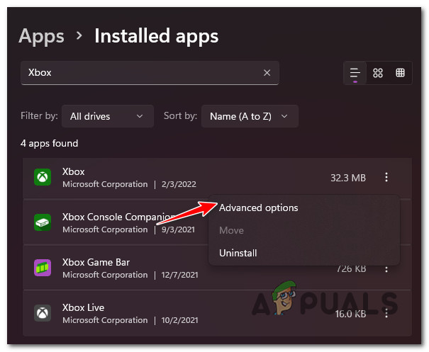 Several Windows 11 users that we’re also unable to install GamePass games confirmed that they manage to fix the issue by repairing or resetting Xbox app from the Installed Apps menu.