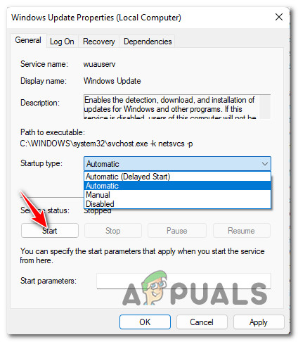 Change the startup type of Windows Update - Once you do this, click on Start to ensure that the service is started.