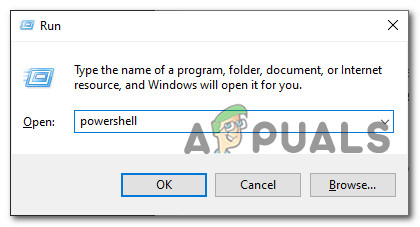 - Press Windows key + R to open up a Run dialog box. Next, type ‘powershell’ inside the text box, then press Ctrl + Shift + Enter to open up an elevated Powershell prompt.