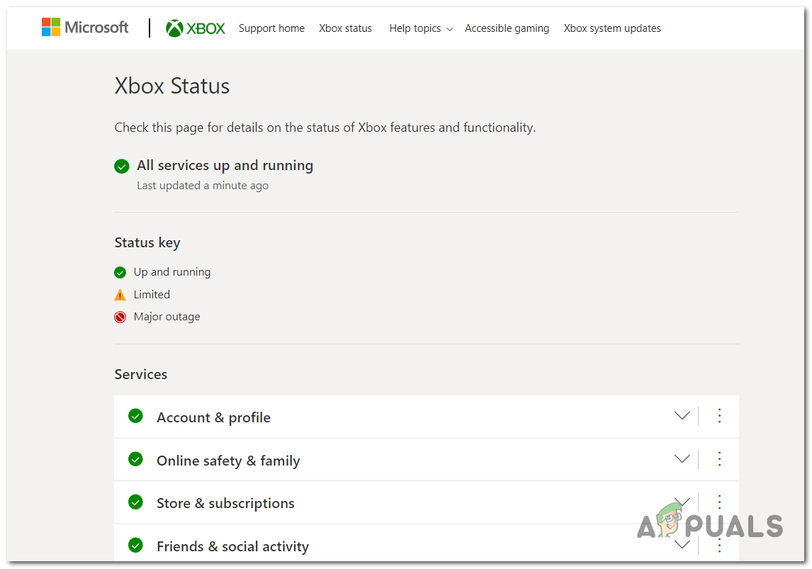 The first place you need to look at is the official Xbox support site where you can see the live server status. Once you are inside this site, you will be able to see a list of all the Xbox services. The icon associated with services should be green if the services are working properly. If the icons are yellow or red, that means the servers are Limited or Major outages. That means the servers are not working properly.