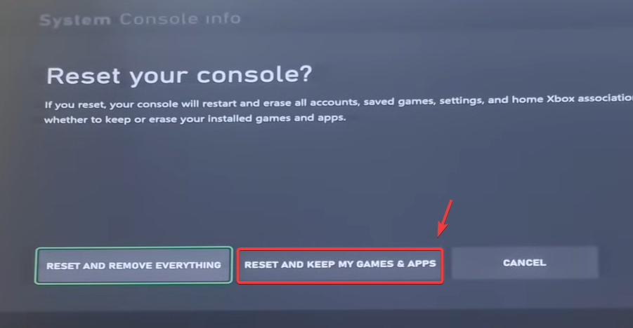 - Select Reset Console, and choose Reset and keep My Games and Apps to proceed.