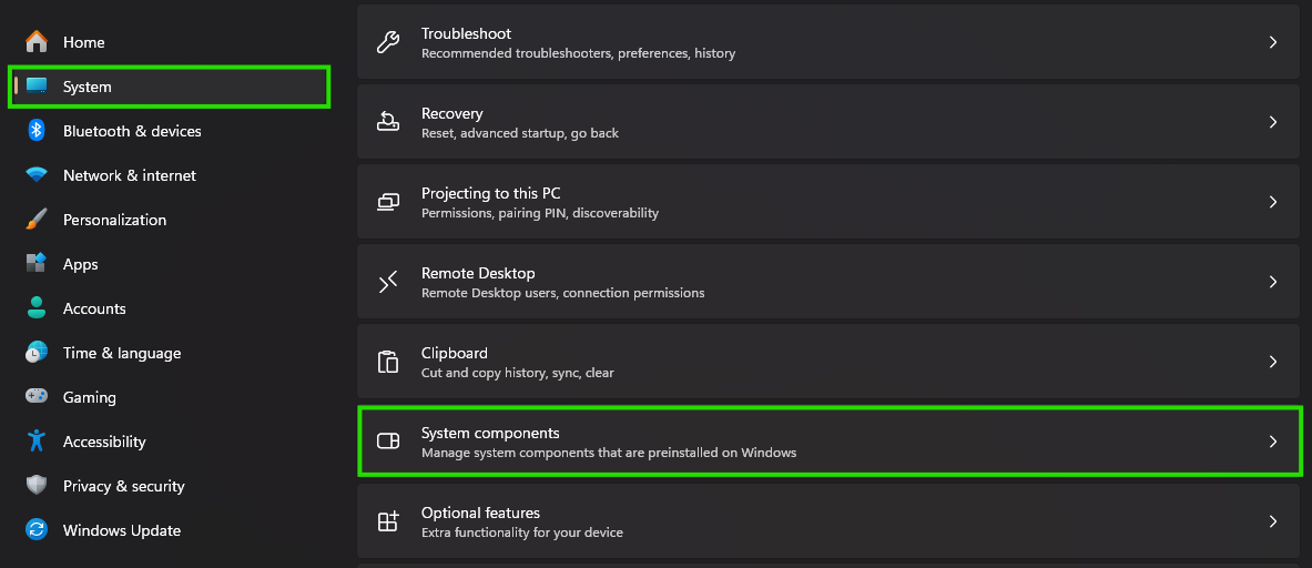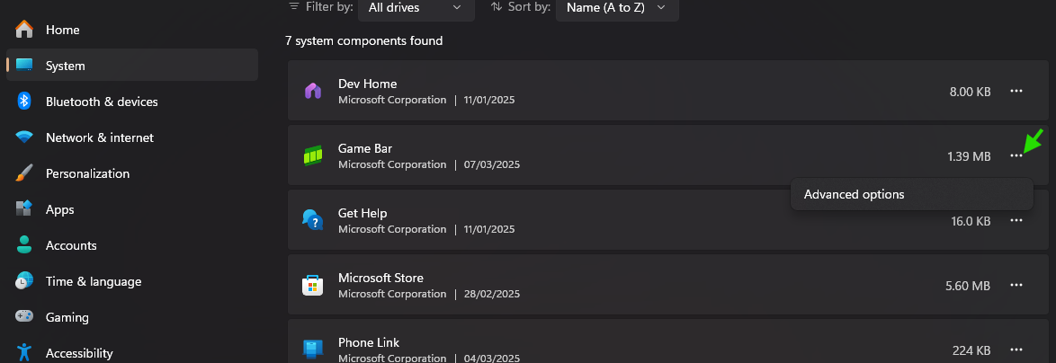- Locate Game Bar in the components list, click the three-dot menu, and select Advanced Options.