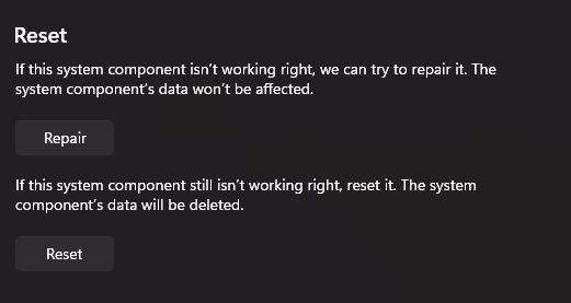 - Click Reset to restore default settings, then select Repair to fix any corrupted files.