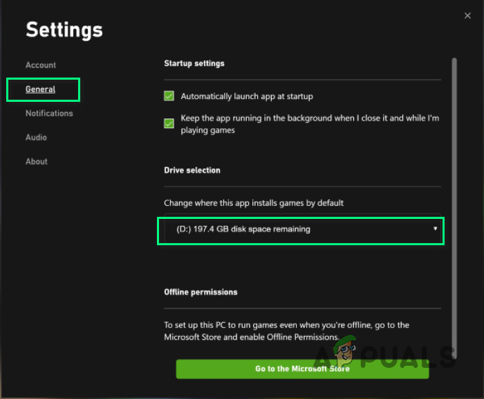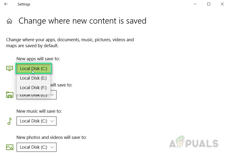 This problem may also arise when the default drive for new games/apps is not the main Windows drive. Changing it to the default drive (i.e. C) resolves the issue. To make these changes, follow the steps:
