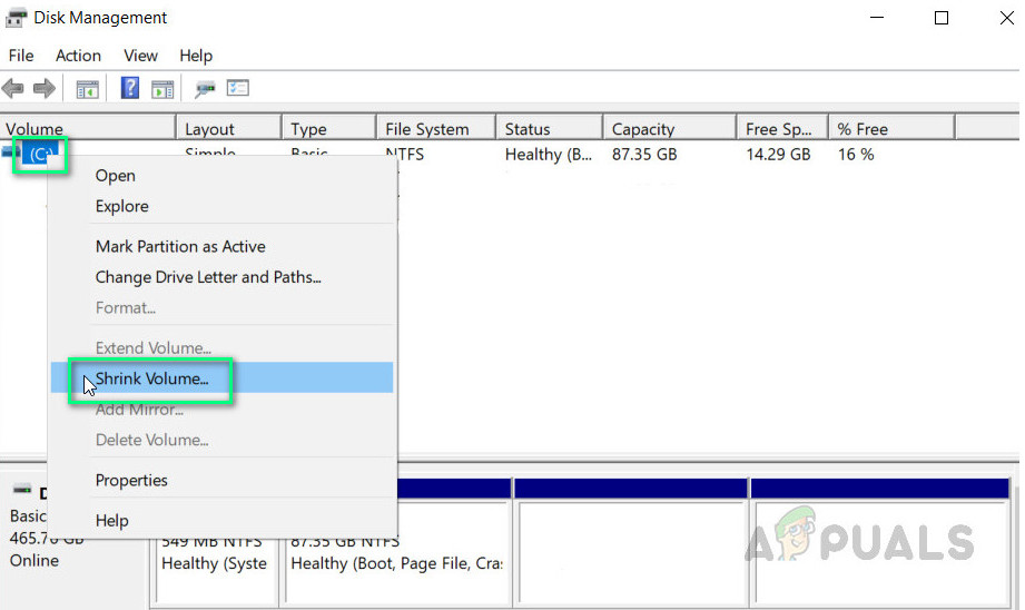 Opening Disk Management - Right-click the C drive in the grid at the top and select Shrink Volume.