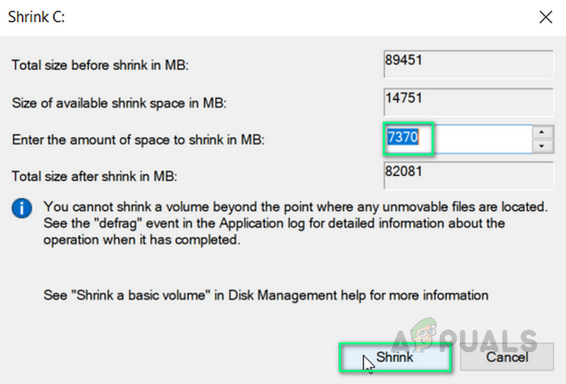 Note: Do not choose the entire amount displayed in the size of available shrink space. You have to leave some space for system reserved files therefore, enter half an amount of the available shrink space to be safe. - Click Shrink and after a moment your C drive will be a bit smaller and you’ll notice a new unallocated section near the bottom. (This process takes some time to proceed)