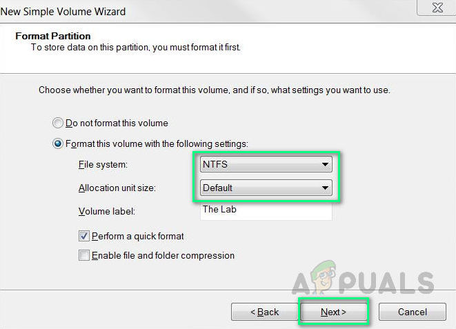 Opening New Sample Volume - Set File System as NTFS, set Allocation Unit Size to Default or 4kb, and click Next. You now have a D drive where you will install the XGP games.