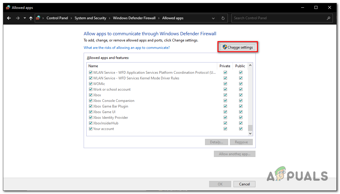 Adding Xbox insider hub to the firewall application list - Click on Change.