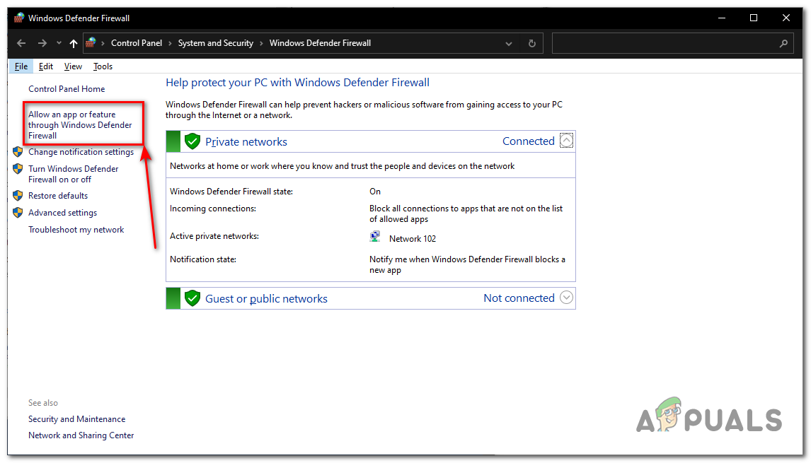 Opening the windows defender firewall - Inside the windows defender firewall, click on Allow an app or feature through windows defender Firewall.
