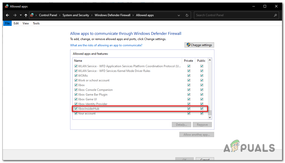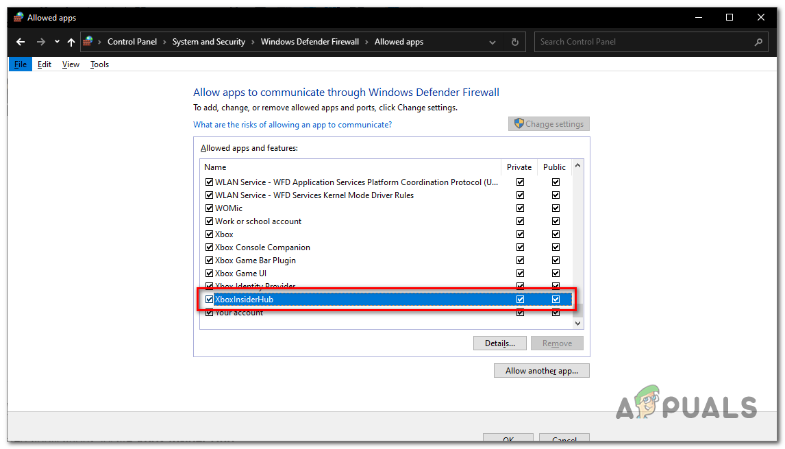Adding Xbox insider hub to the firewall application list - Now, Make sure to Check both the Private and Public boxes.