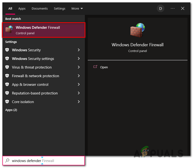 - In the search box, type Windows defender firewall and double-click to open.