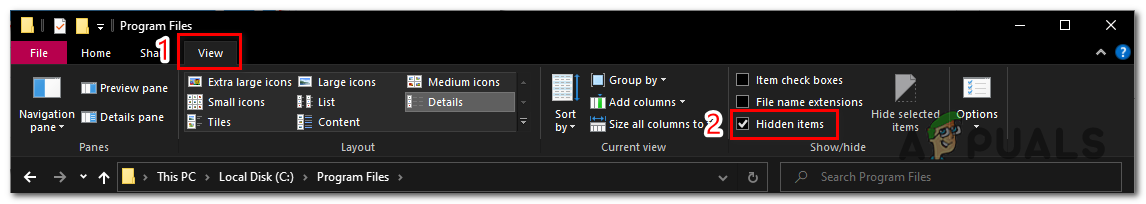- Click on the View tab and check the Hidden items check box as shown in the image below.