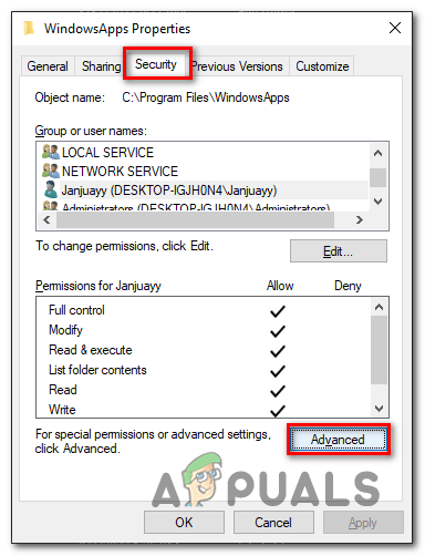 - Click on the Security tab and click on Advanced.