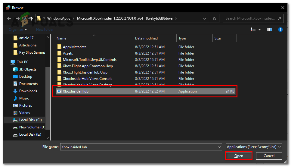 - Select the Xbox Insider hub application file and click on the Open button.