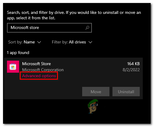 - Click on Microsoft store and click on Advanced options.