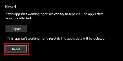 Resetting the Microsoft store cache - Scroll down and click on Reset.