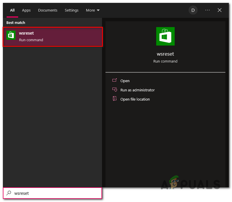 - Press the Windows key to open the start menu; In the search box, type Wsreset.exe.
