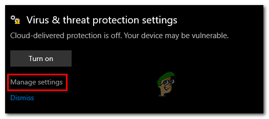 Disabling Windows Defender - Click on Manage settings under the virus and threat protection settings.