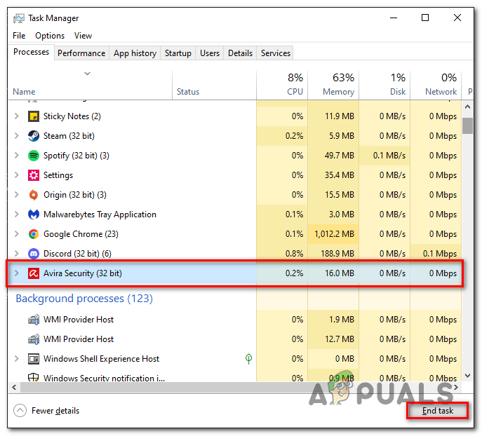 - Locate your antivirus and click on End task to completely shut off any background processing of the application.