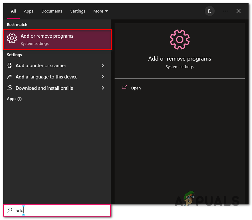 - In the search box, type Add or remove programs.
