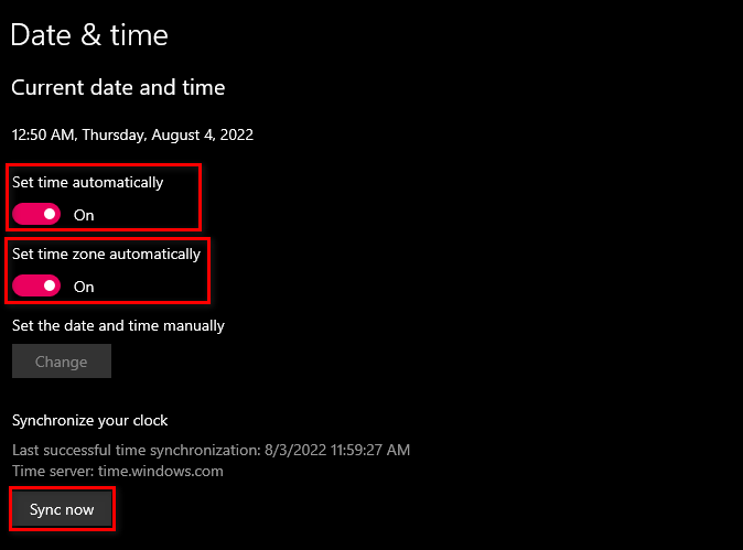 - Toggle the Set time automatically switch to on.