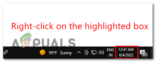 - Right-Click on the taskbar where time is present, as shown in the image below.
